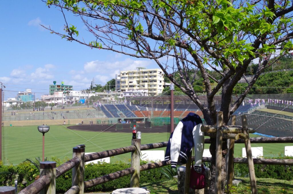 那覇から近くアクセスのよい球場で、ファミリー層にも人気のキャンプ地。選手と観客の距離が非常に近く、アップ時の声やバッティング音がリアルに響きます。